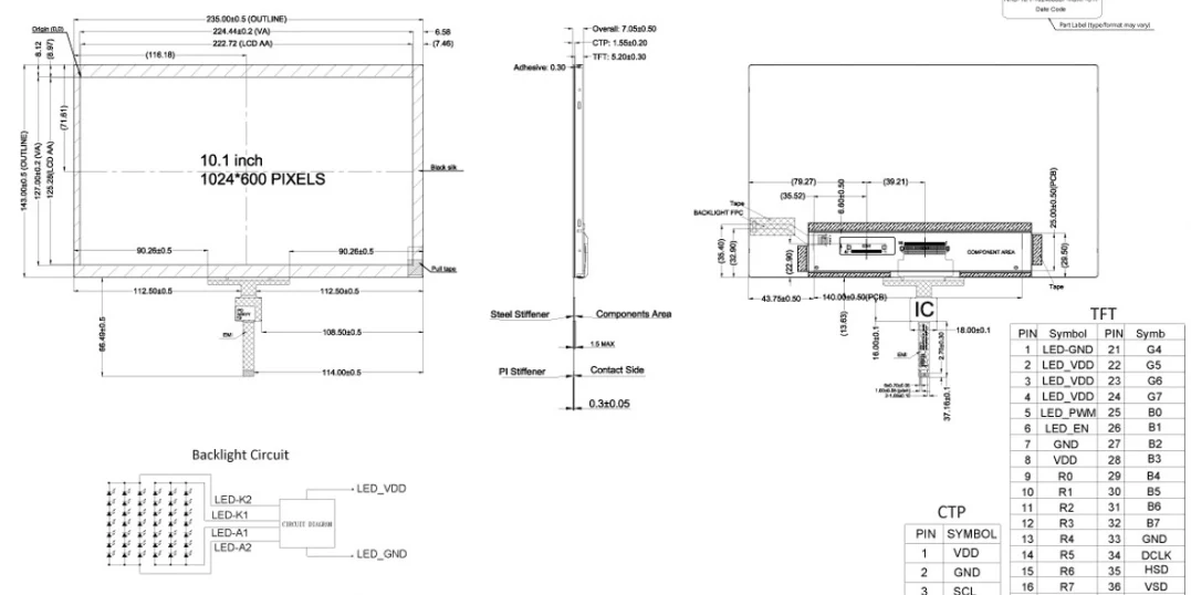 Vékony, mindössze 235 mm × 143 mm × 7,05 mm-es méretei alkalmassá teszik kompakt eszközökhöz. A 3,3 V-os tápellátással és 40 tűs FFC kábellel (6 tűs FFC CTP-hez) 10,1 hüvelykes ipari PCAP érintőképernyő modul -20°C és 70°C közötti hőmérsékleten működik, tárolási hőmérséklete pedig -30°C és 80°C között van, így még zord körülmények között is megbízható működést biztosít.